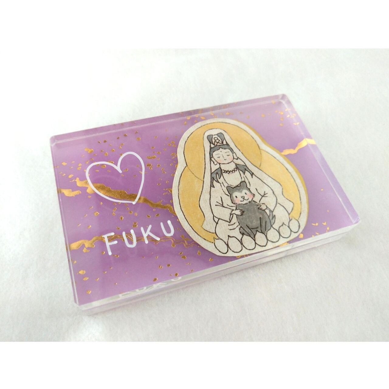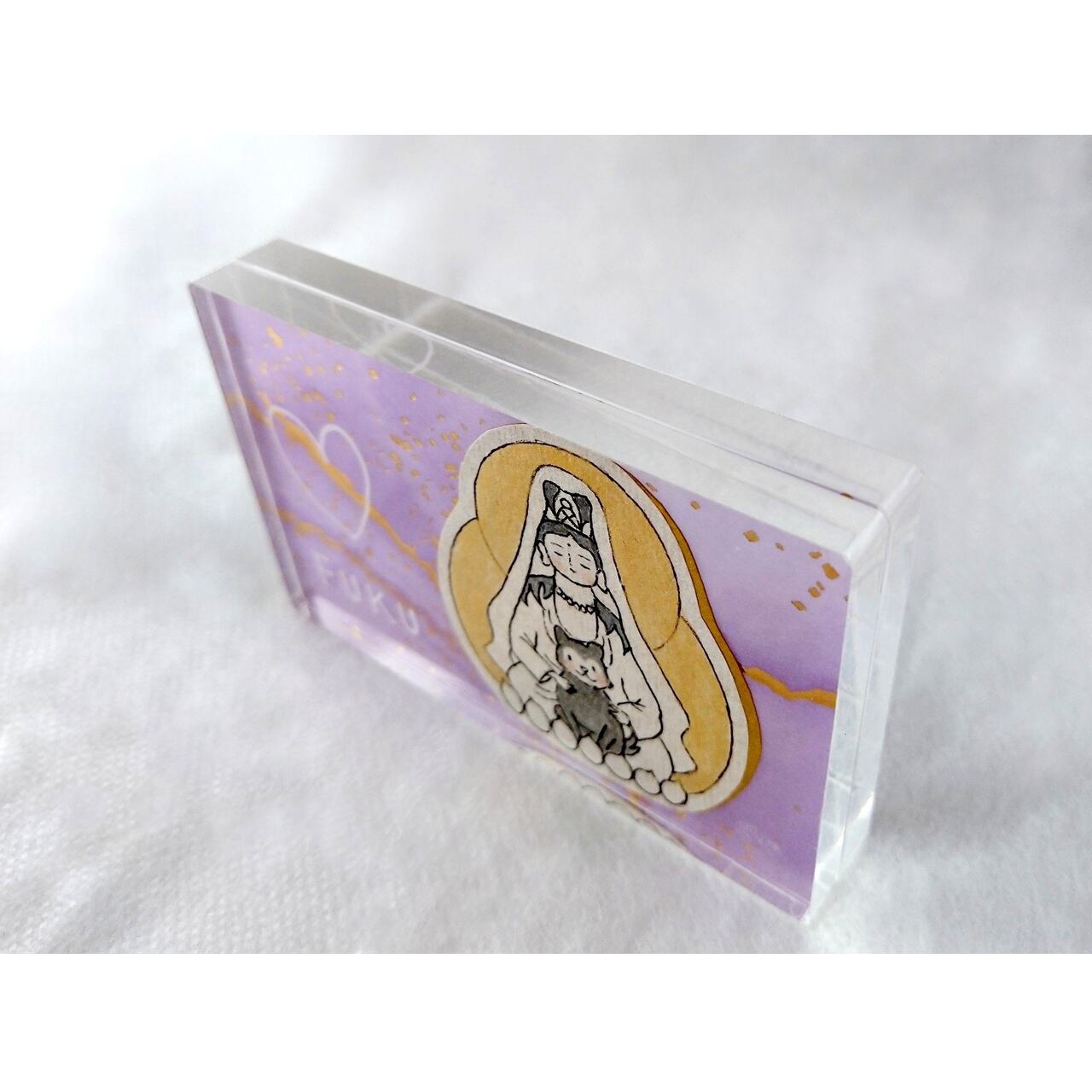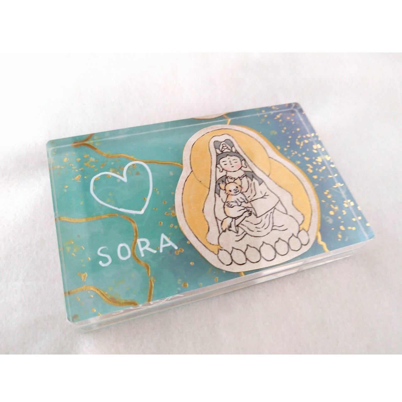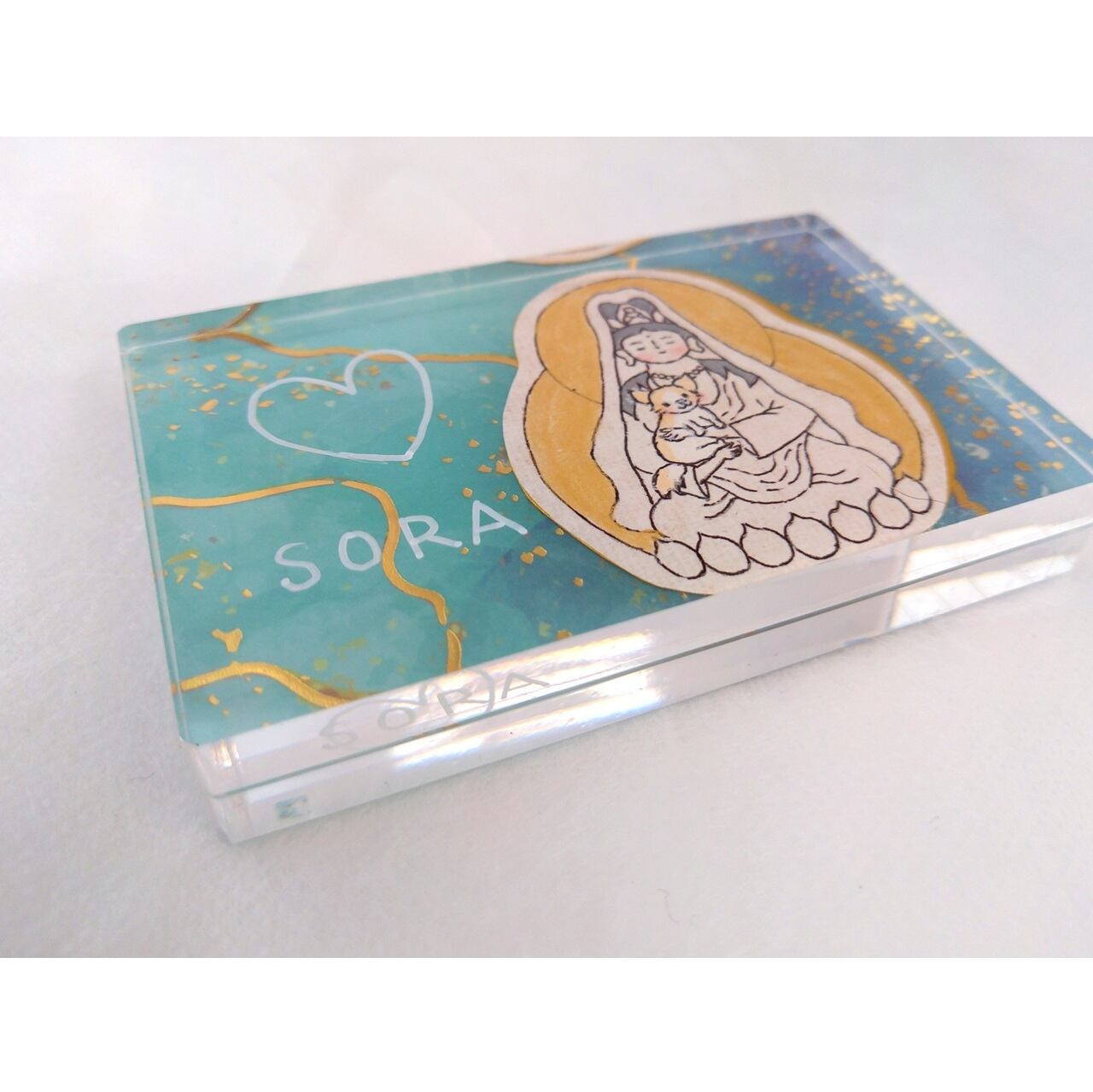 マーブルや金継ぎのような綺麗なデザインペーパーと合わせアクリルブロックで挟み、表面にワンちゃんのお名前とハート柄を書きました。
