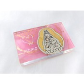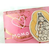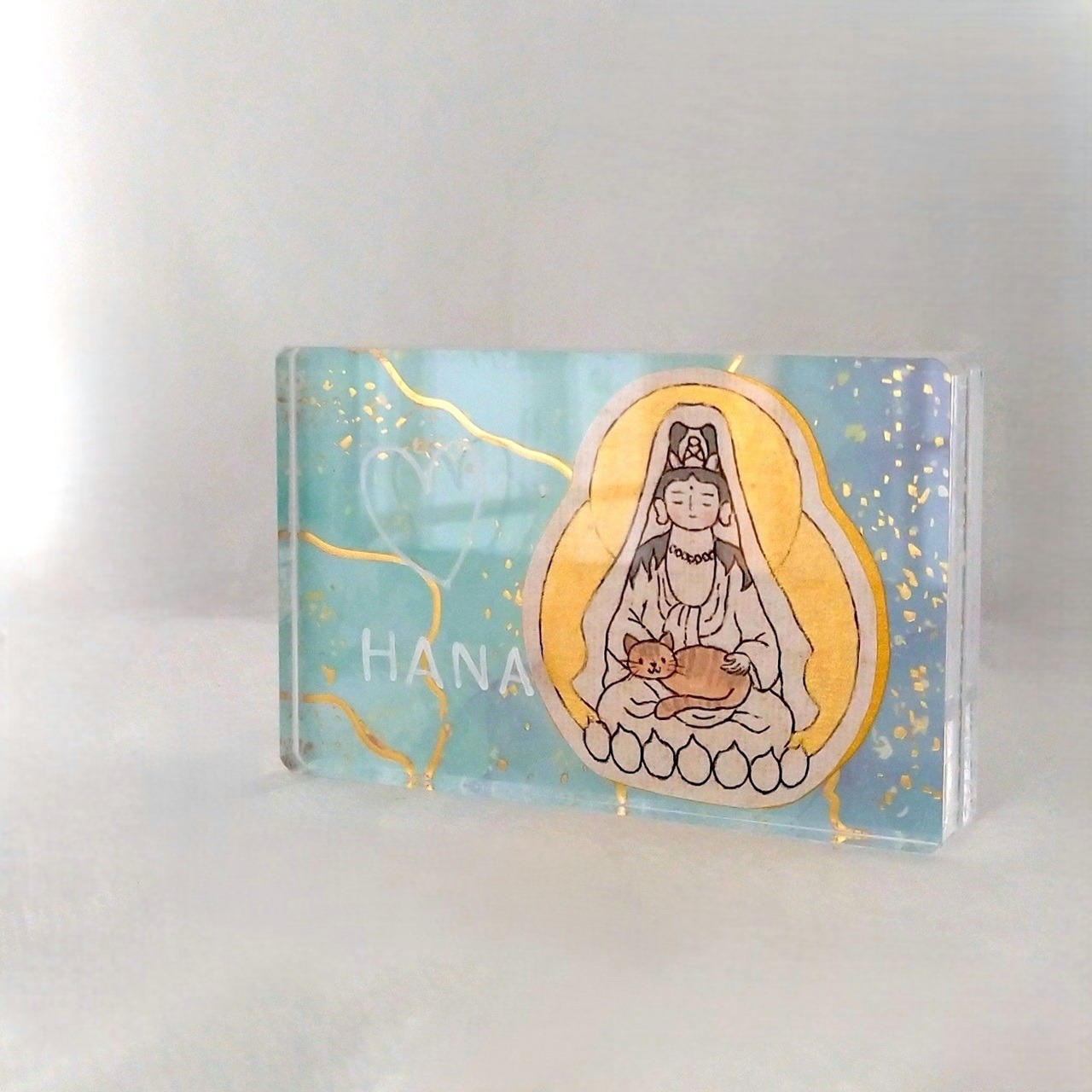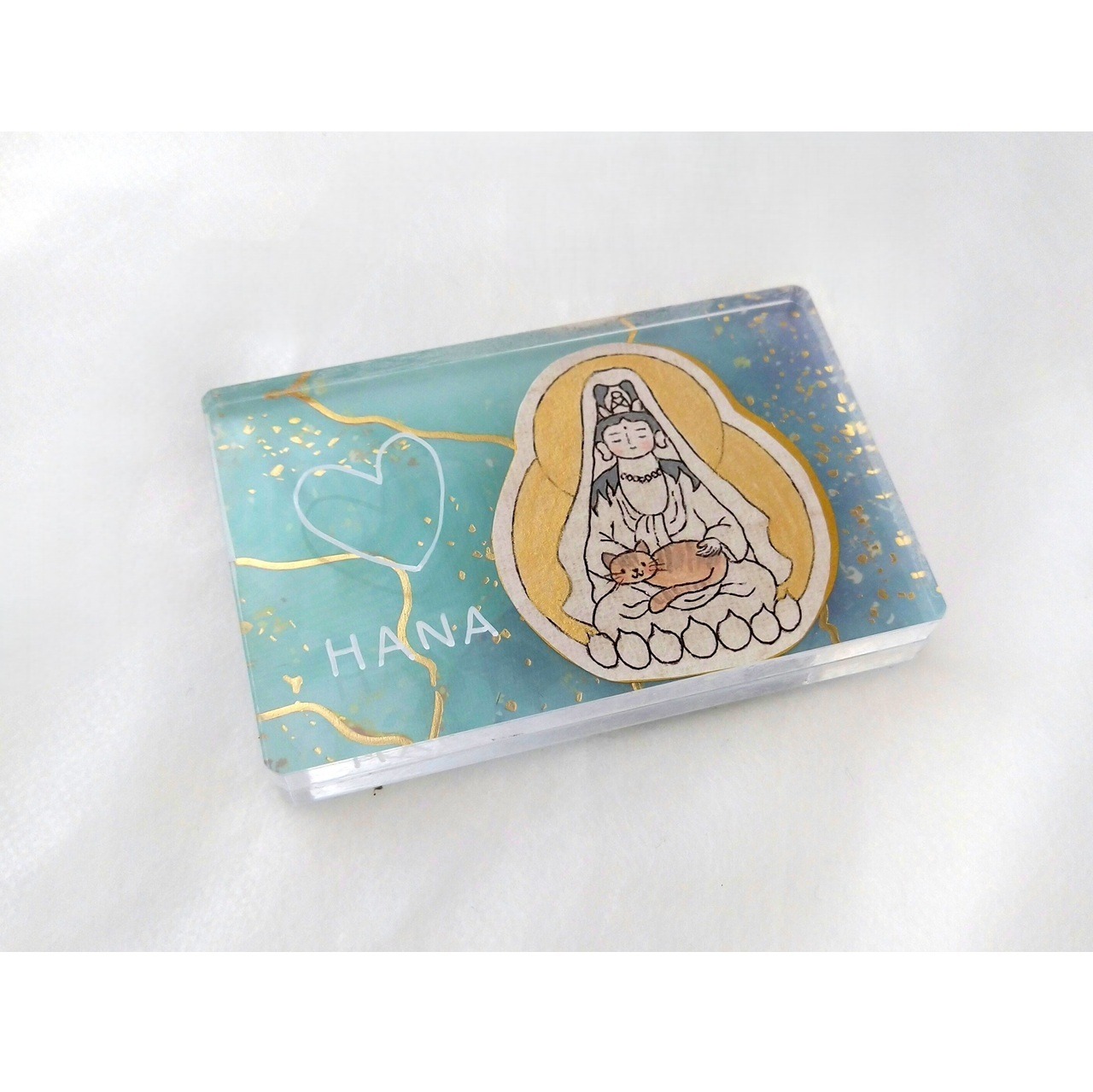 マーブルや金継ぎのような綺麗なデザインペーパーと合わせアクリルブロックで挟み、表面にネコちゃんのお名前とハート柄を書きました。