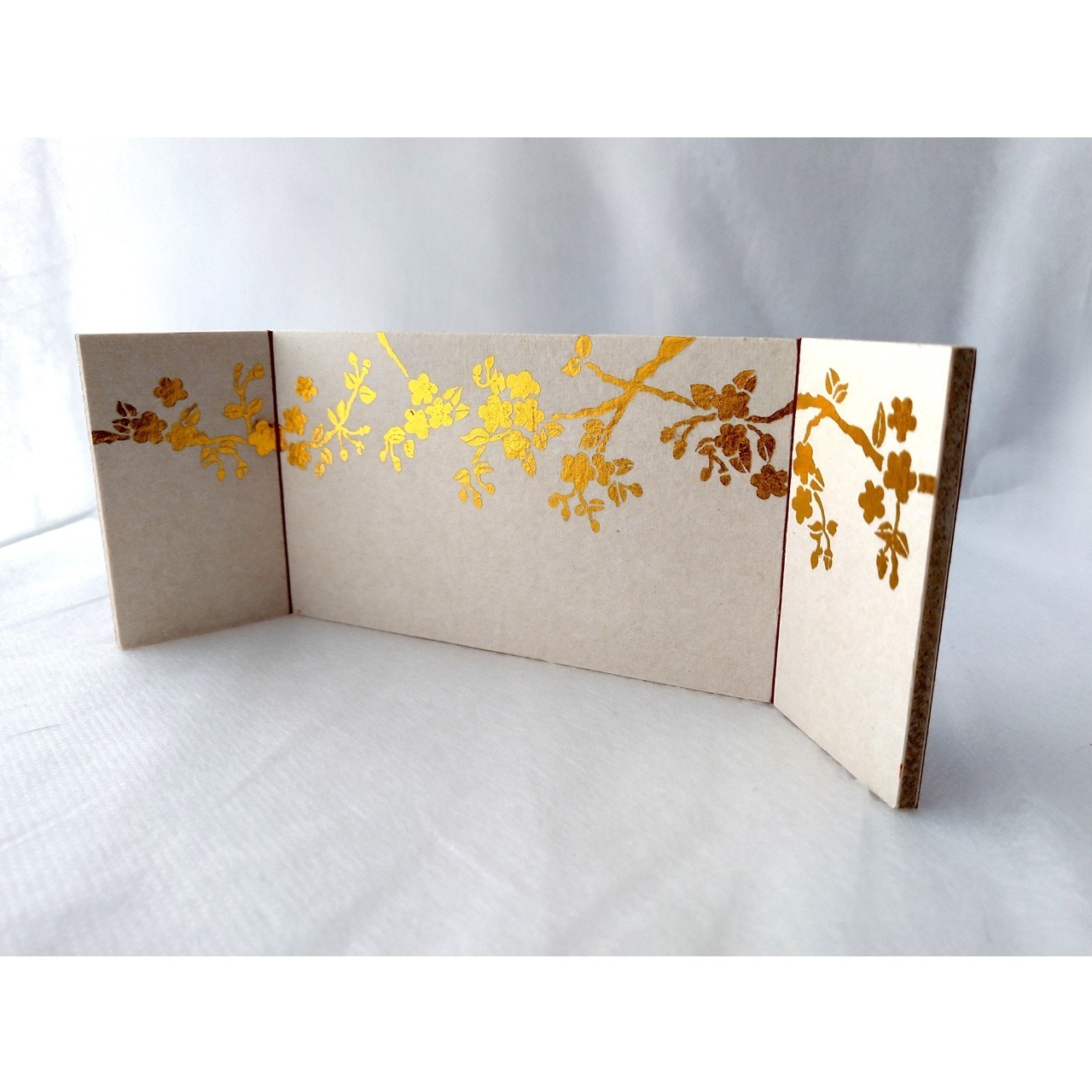 桃の花の屏風は、フェイク金箔で柄を表した華やかな雰囲気の屏風です。