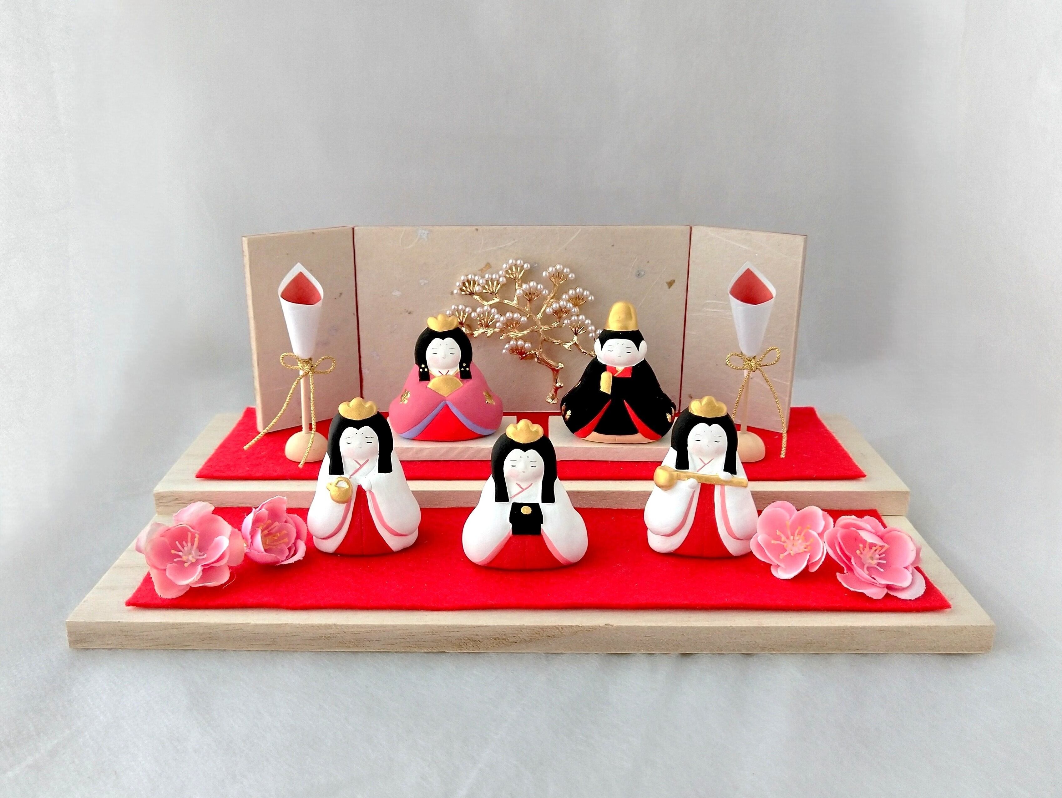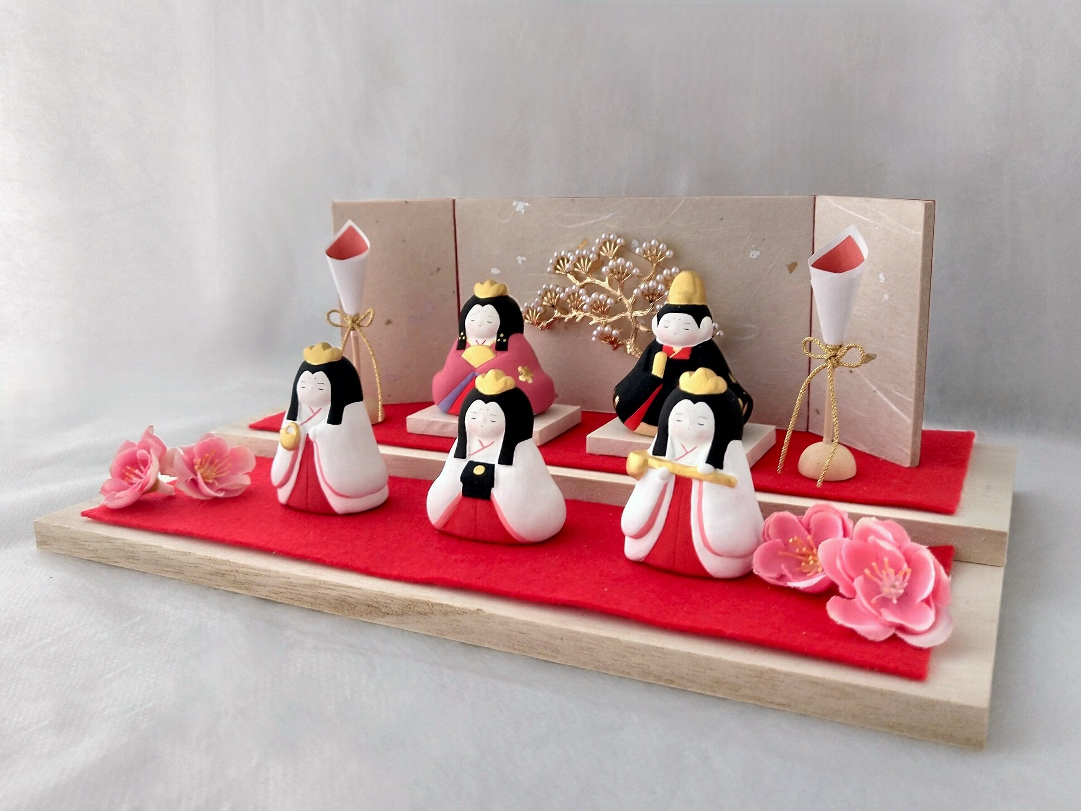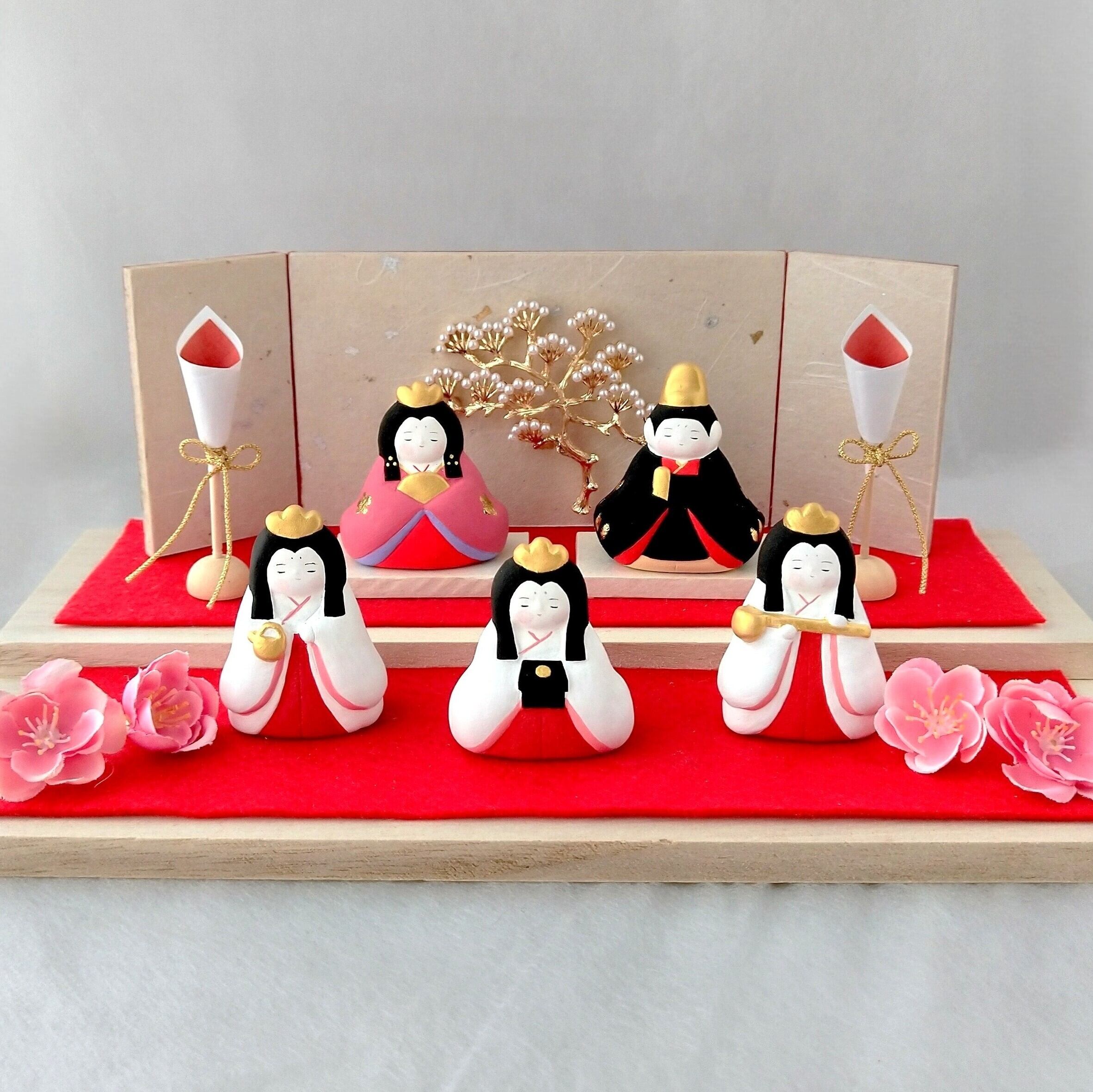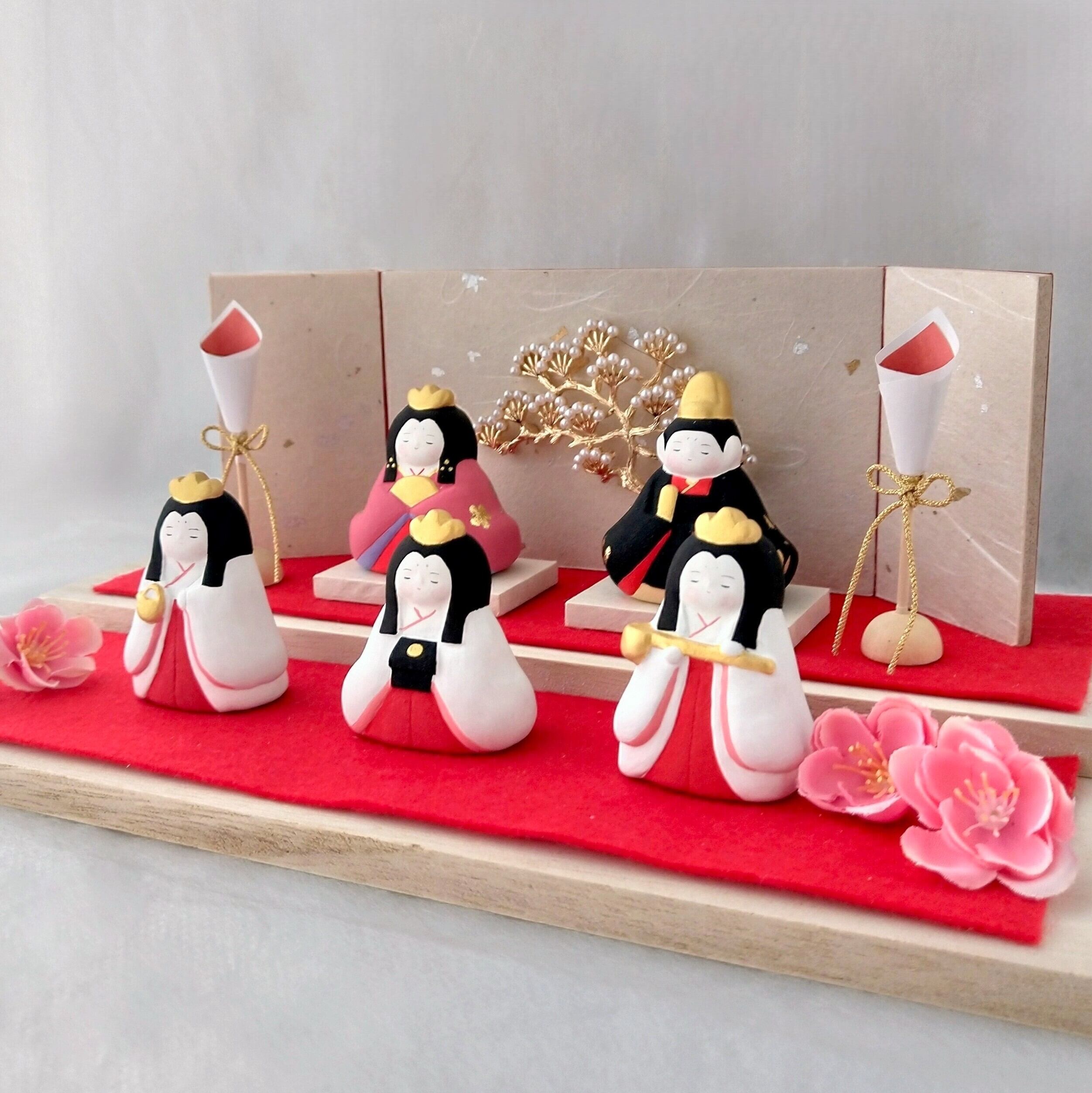 少しのスペースで華やか可愛く飾れる おひなさま 百花(ももか)の五人飾りです。