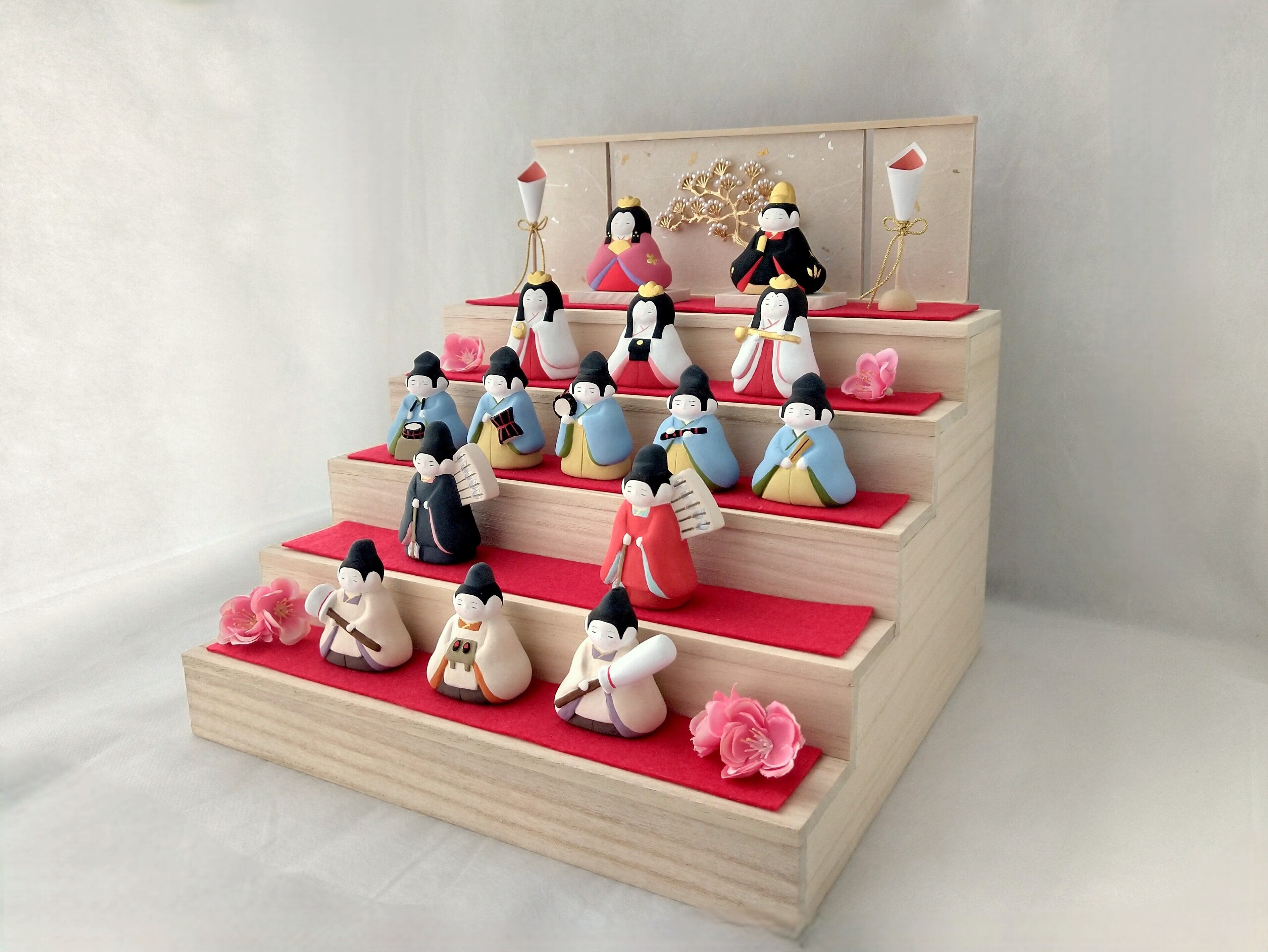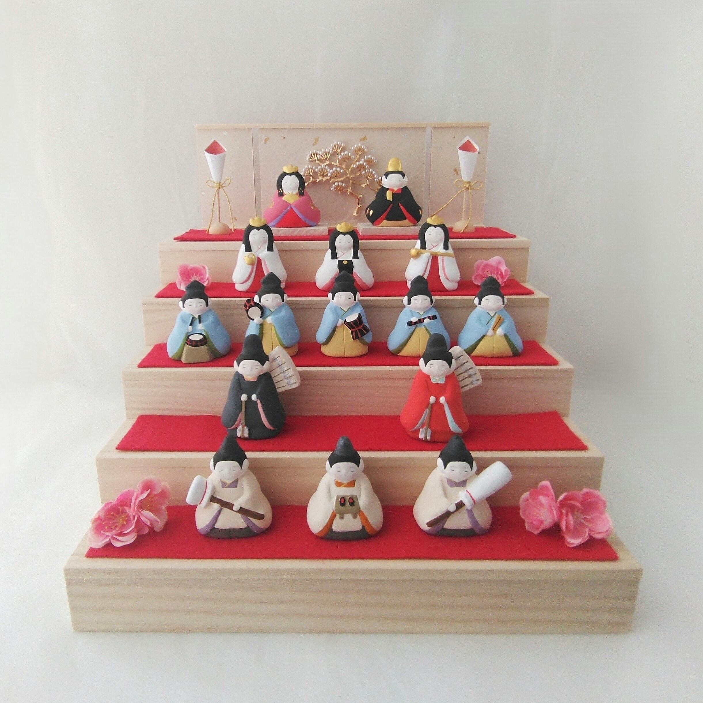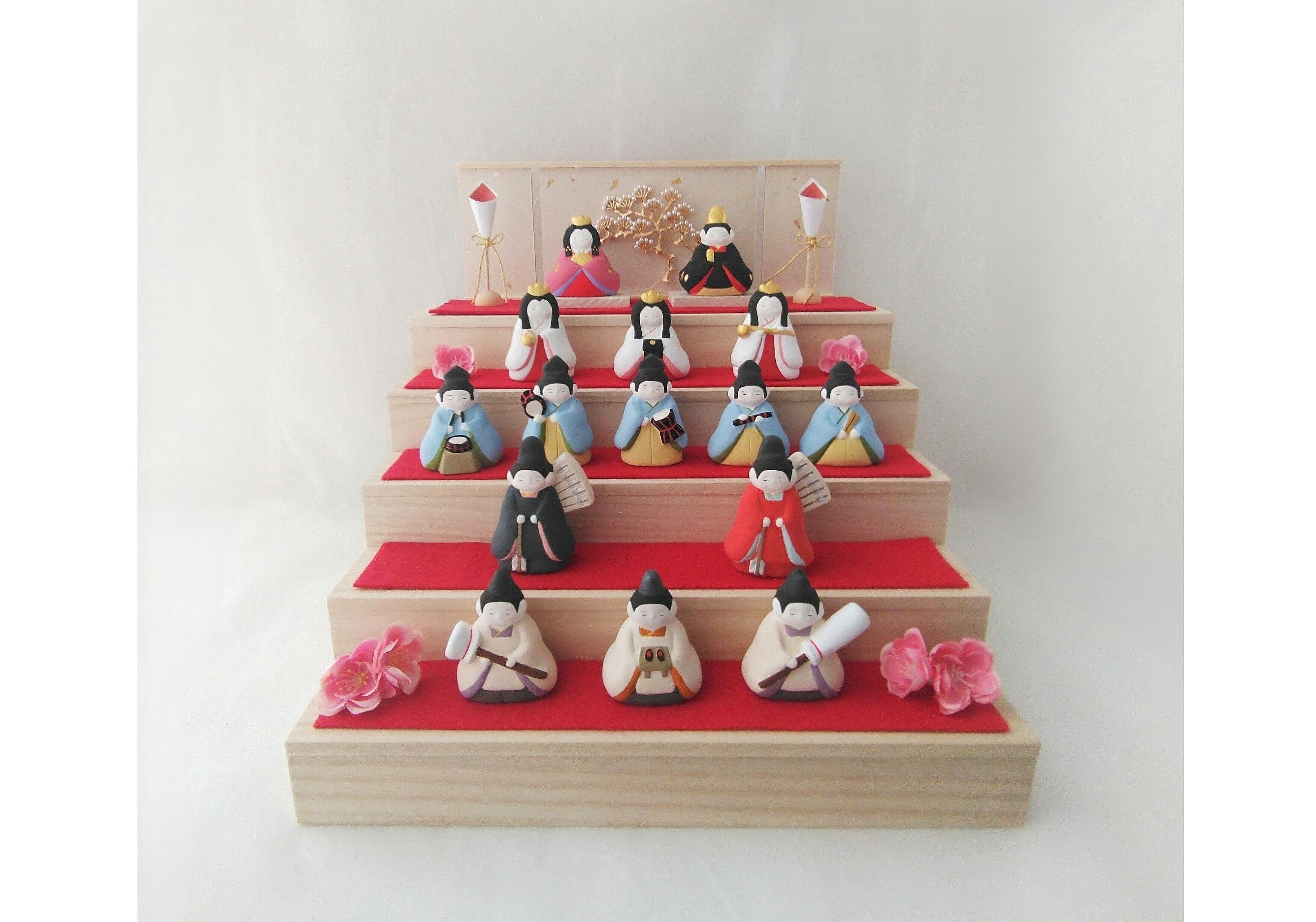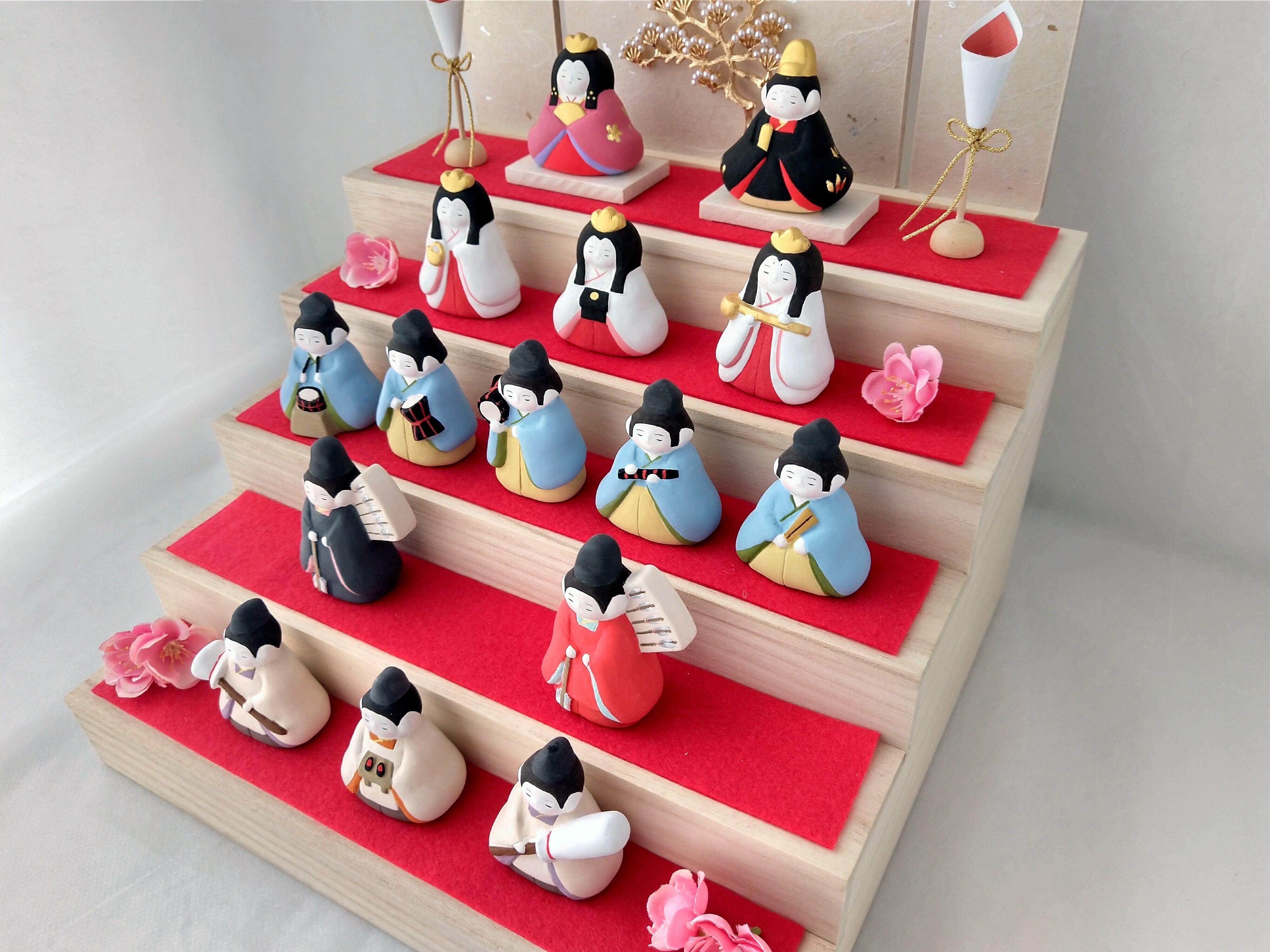 少しのスペースで華やか可愛く飾れる おひなさま 百花(ももか)の十五人飾りです。
