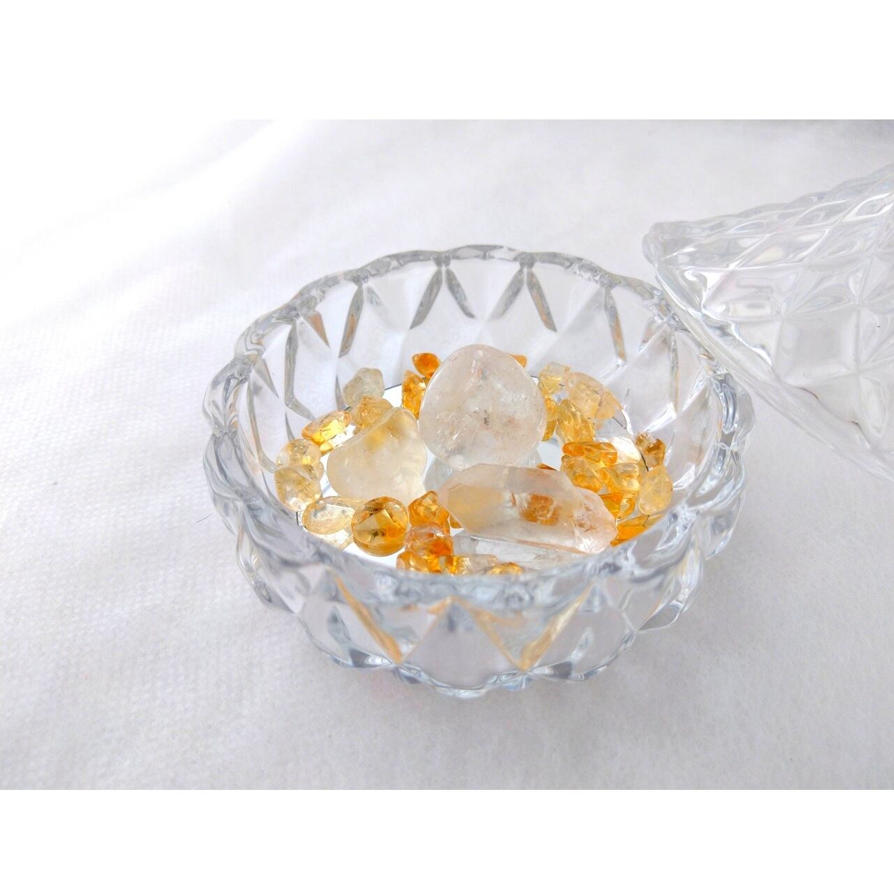 ガラス製の可愛キャニスターに入っているのは、水晶(タンブル、ポイント)とシトリン(タンブル、さざれ石)