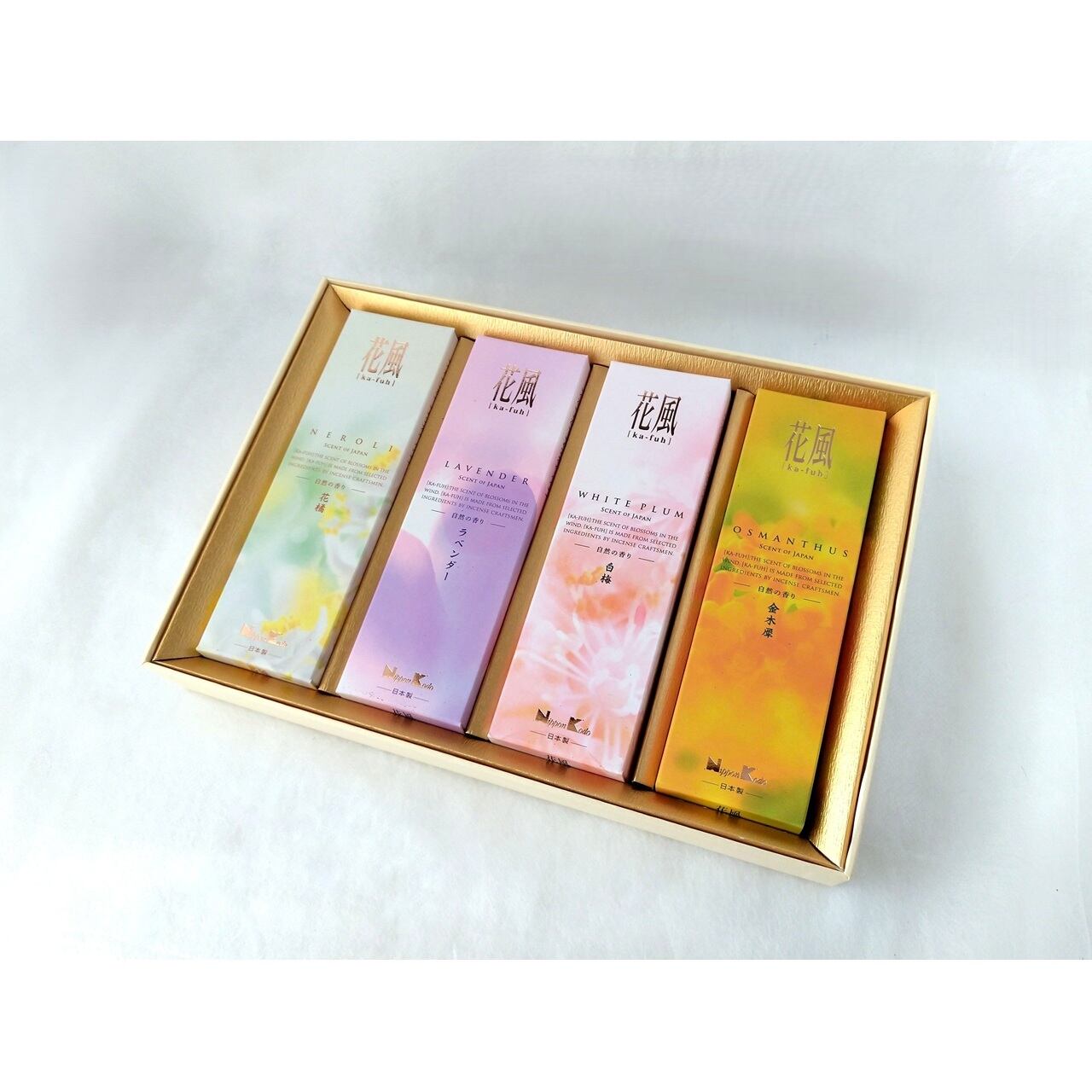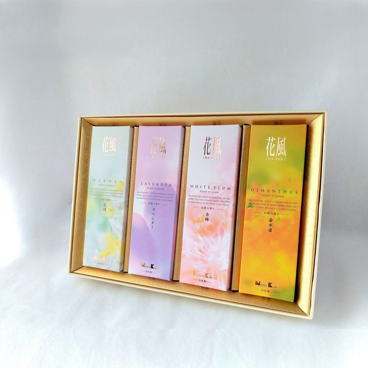 花橘・ラベンダー・白梅・金木犀の4種のお花の香りを詰合せた贈答用お線香です。