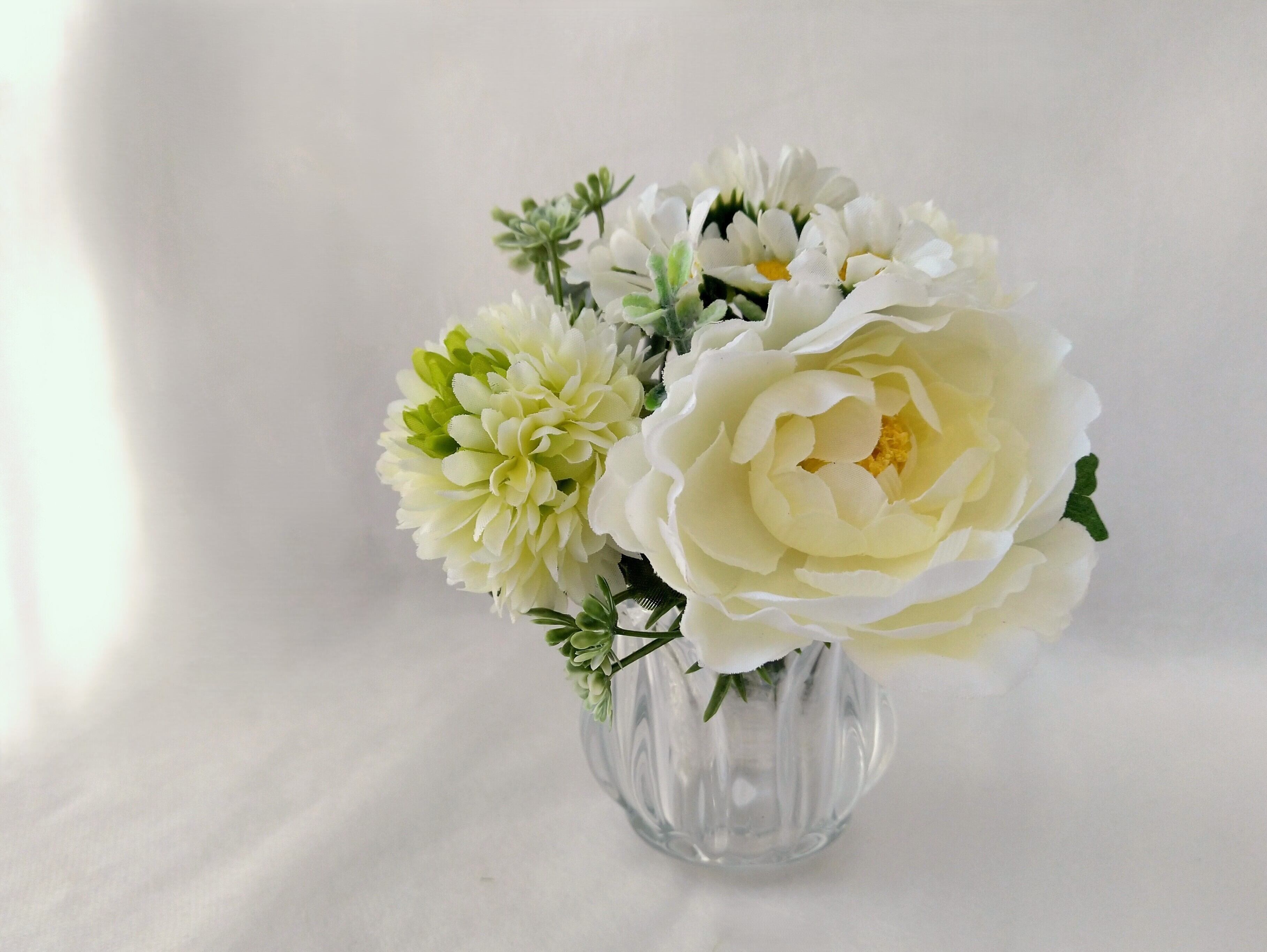 短く束ねたお花を小さなガラス製の花瓶に入れました。