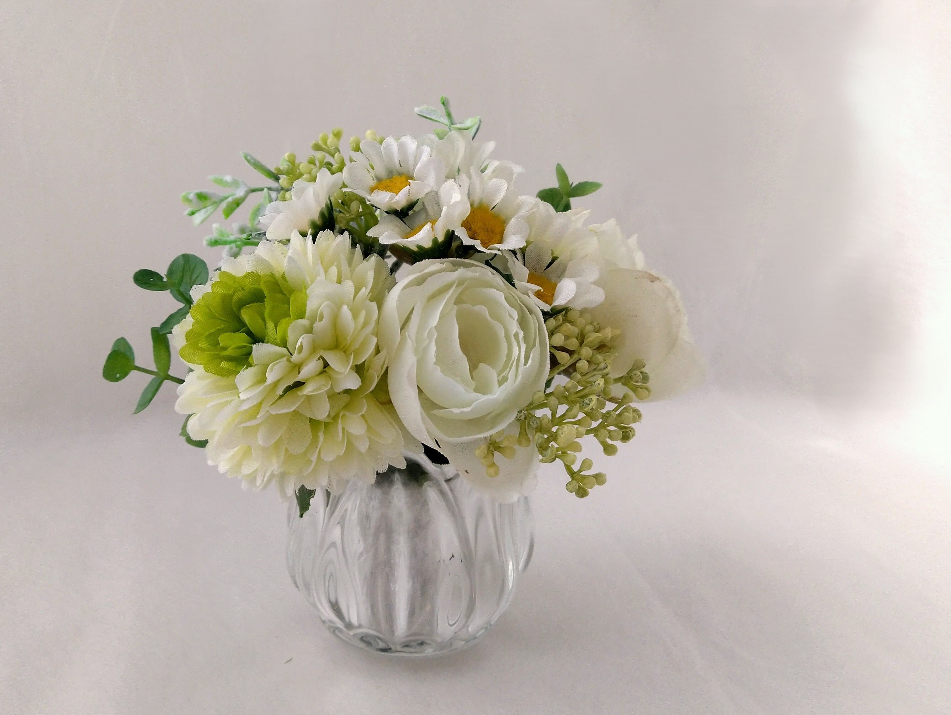 短く束ねたお花を小さなガラス製の花瓶に入れました。