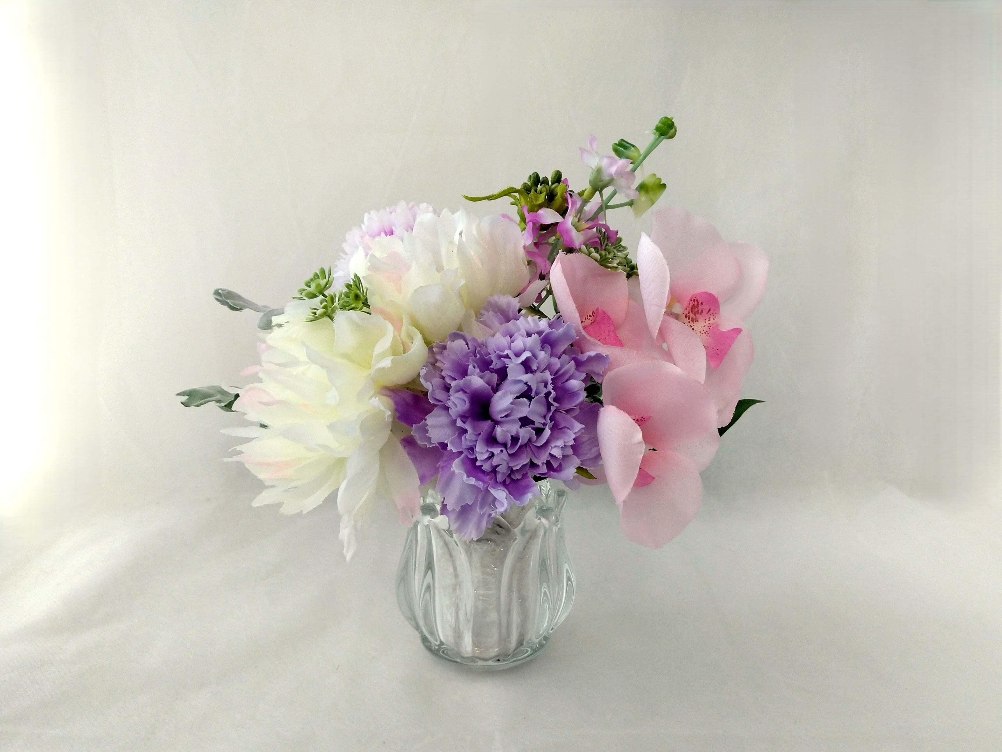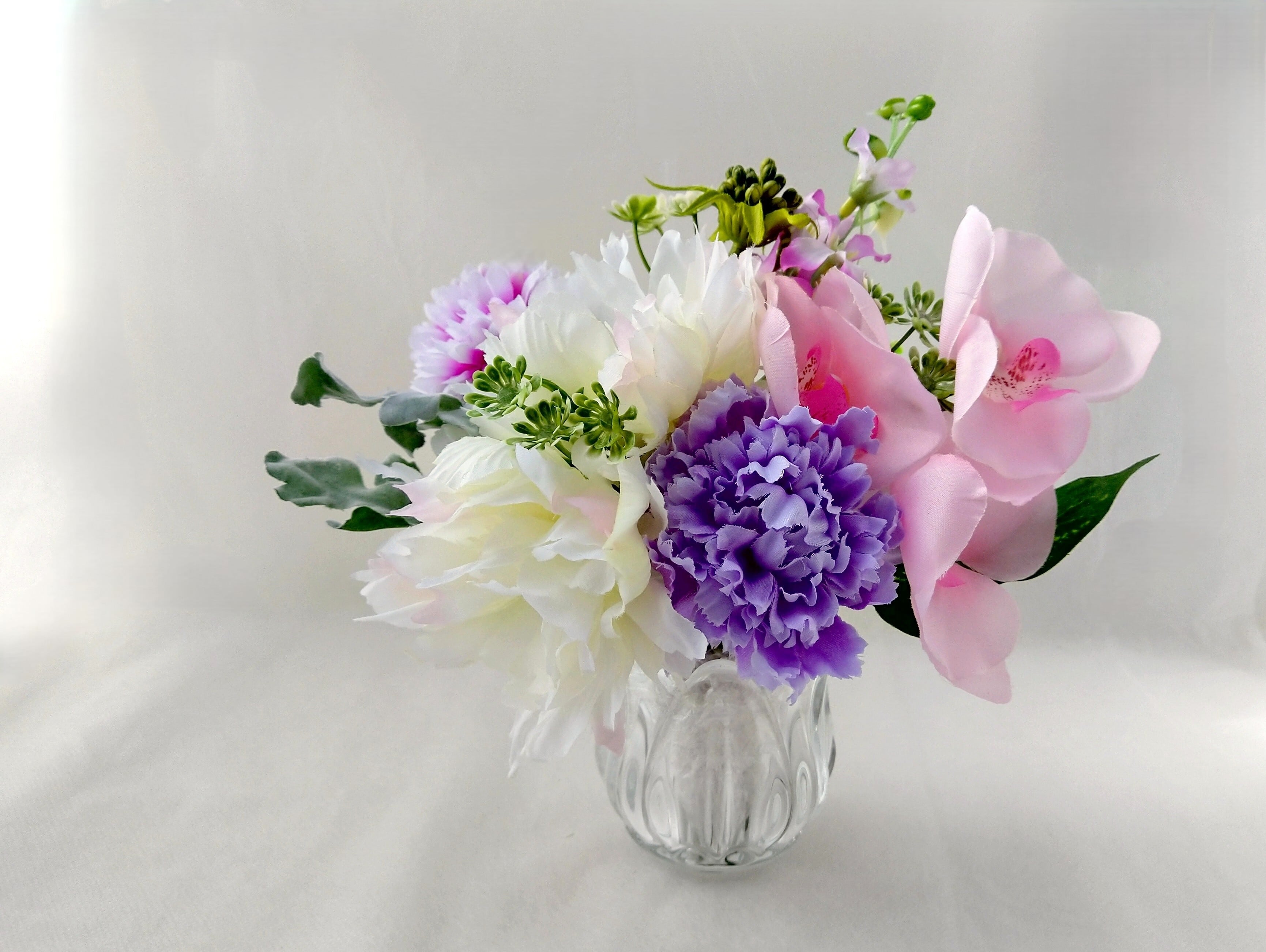 胡蝶蘭・芍薬・ピンポンマム・スカビオサなどのお花になります。