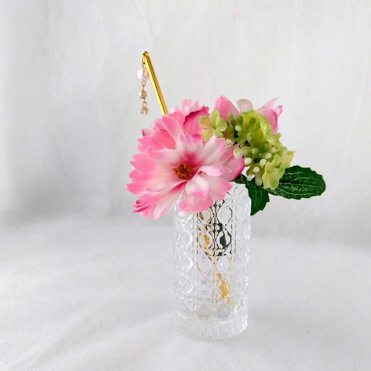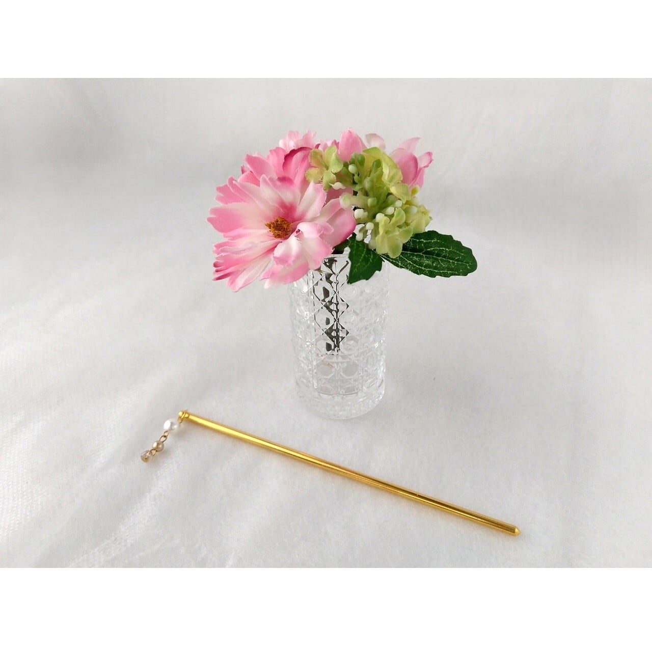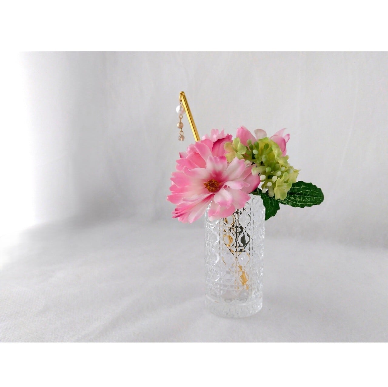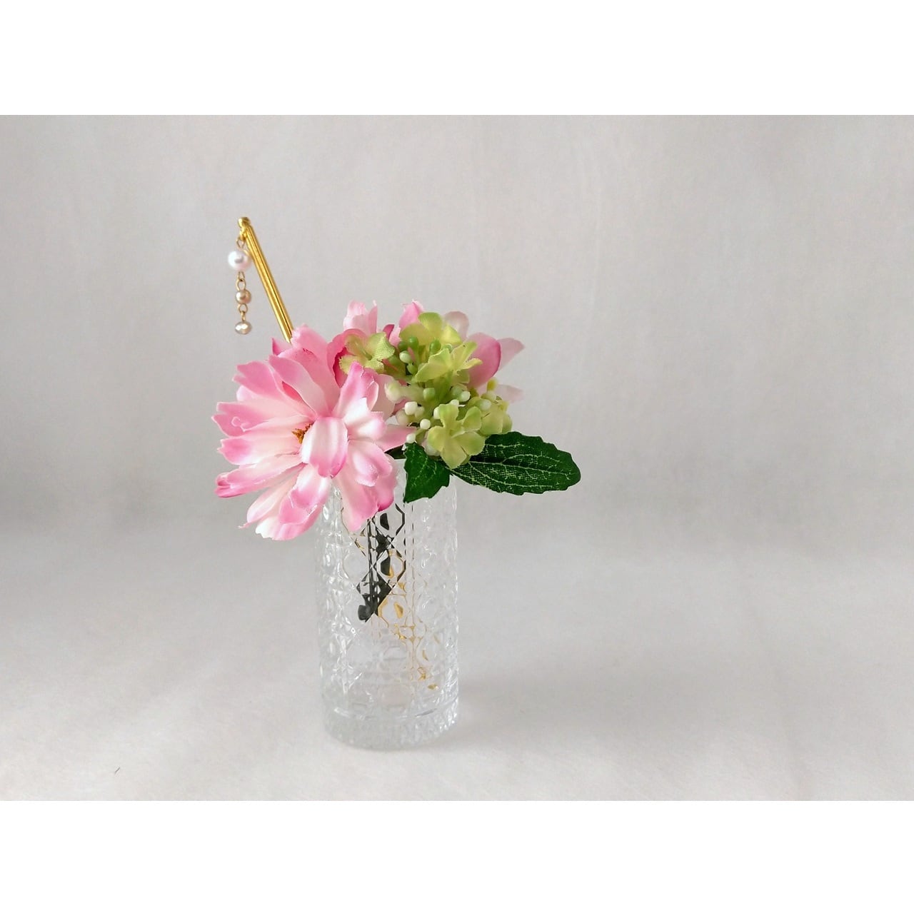 お花と一緒に挿したステックは、ビーズをあしらった「かんざし」です。